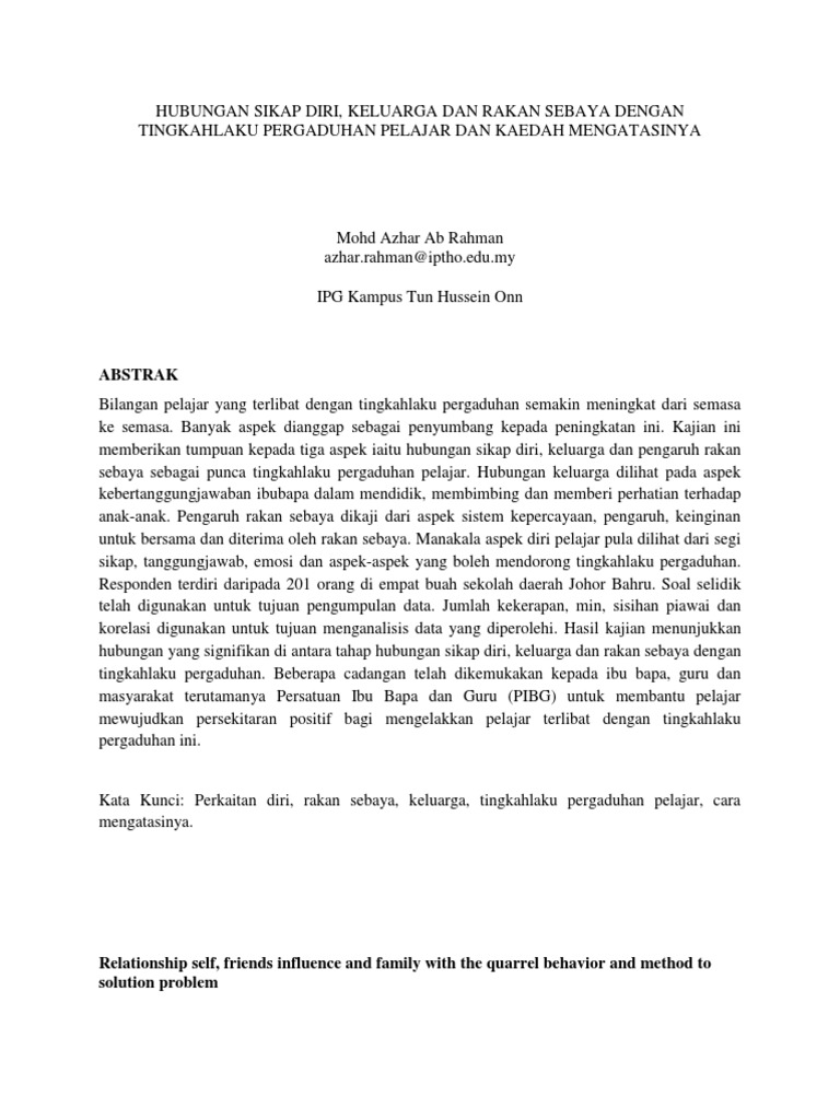 Jurnal Hubungan Diri Raka Nsebaya Dan Keluarga Dengan Tingkah Laku Pergaduahan Pelajar Pdf