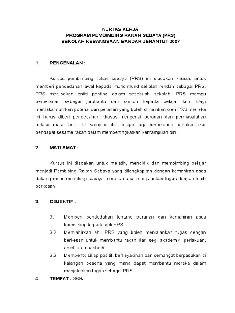 SEKOLAH KEBANGSAAN PUTRAJAYA PRESINT 112 WILAYAH PERSEKUTUAN PUTRAJAYA KERTAS KERJA PENUBUHAN PEMBIMBING RAKAN SEBAYA PRS PERINGKAT SEKOLAH RENDAH 10 RASIONAL Khidmat bantu membantu murid merupakan satu khidmat sokongan yang penting dalam Perkhidmatan Bimbingan dan Kaunseling di sekolah.