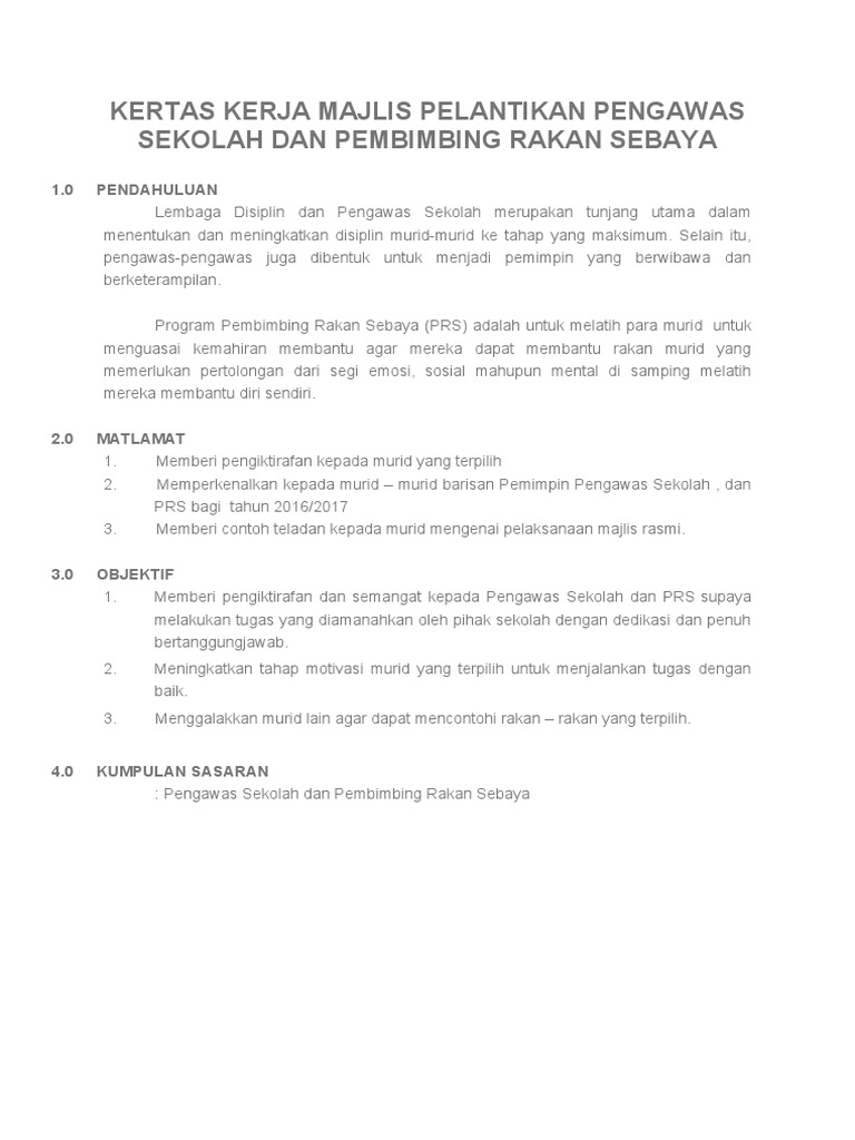 Saban tahun pelbagai program. SEKOLAH KEBANGSAAN PUTRAJAYA PRESINT 112 WILAYAH PERSEKUTUAN PUTRAJAYA KERTAS KERJA PENUBUHAN PEMBIMBING RAKAN SEBAYA PRS PERINGKAT SEKOLAH RENDAH 10 RASIONAL Khidmat bantu membantu murid merupakan satu khidmat sokongan yang penting dalam Perkhidmatan Bimbingan dan Kaunseling di sekolah. Contoh Kertas Kerja Program Untuk Muka Depan KERTAS KERJA.